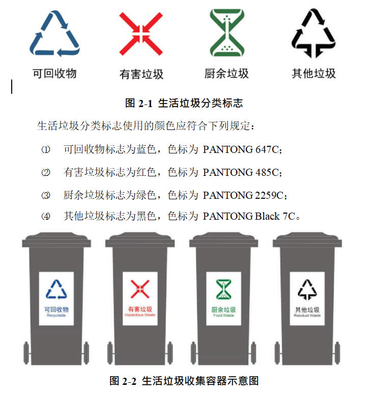城市生活垃圾分類標(biāo)志和顏色應(yīng)符合《生活垃圾分類標(biāo)志》(GB/T 19095)的規(guī)定。