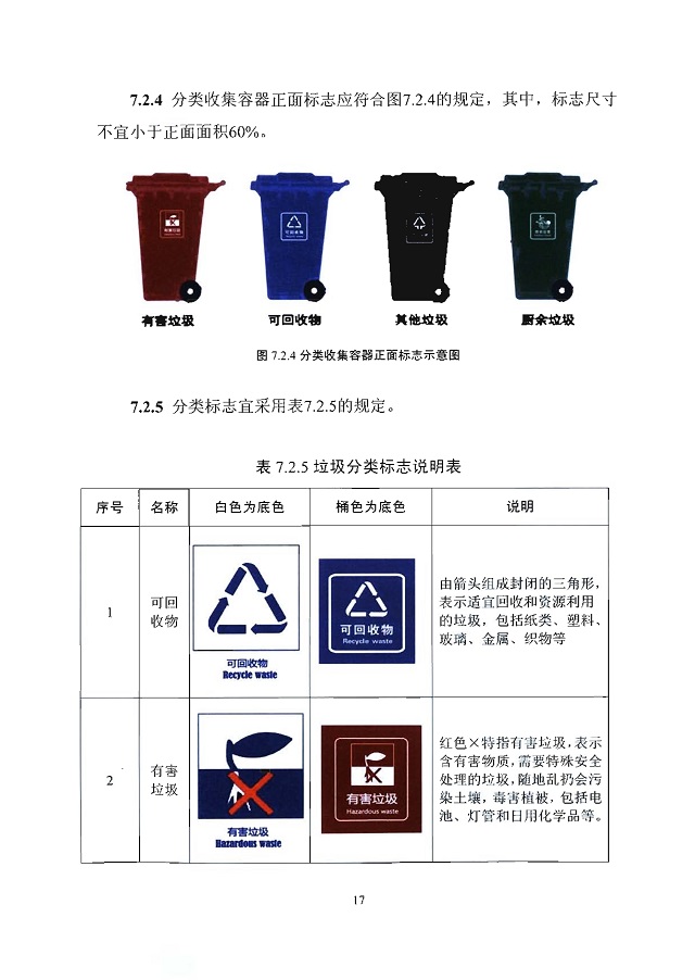 4.1.1實(shí)施“四分類”的小區(qū),應(yīng)配置規(guī)范的有害垃圾、廚余垃圾、 可回收物、其他垃圾四婁收集容器。實(shí)施“三分類”的居住小區(qū),應(yīng)配置 規(guī)范的有害垃圾、可回收物、其他垃圾三類收集容器。