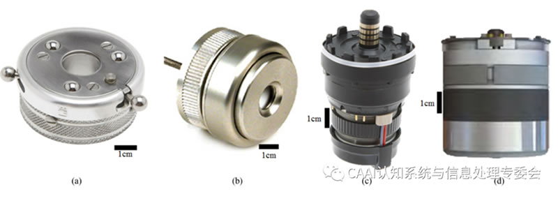 主動(dòng)單自由度腕部通常在假肢和機(jī)器人應(yīng)用中都能找到。在假肢L域,這些系統(tǒng)通常與EMG系統(tǒng)一起使用,使用戶能夠通過肌肉信號(hào)控制旋轉(zhuǎn);顒(dòng)手腕可以是獨(dú)立的單元集成到假手中,或者集成到較大假手中的前臂中。與被動(dòng)手腕類似,主動(dòng)單自由度裝置也可分為旋轉(zhuǎn)器和屈肌。主動(dòng)旋轉(zhuǎn)器是腕部假體中常見的動(dòng)力裝置。獨(dú)立設(shè)備包括運(yùn)動(dòng)控制電動(dòng)旋轉(zhuǎn)器和OB腕部旋轉(zhuǎn)器,如圖(c)所示,這兩種設(shè)備都是為與許多終端設(shè)備兼容而設(shè)計(jì)的,因而得到了相對(duì)廣泛的應(yīng)用。OB-Michelangelo手和TBi-Limb Quantum都使用緊湊的旋轉(zhuǎn)器,即軸旋轉(zhuǎn)和俯臥旋轉(zhuǎn)[圖(d)],它們分別安裝在各自手的假體窩和下手掌中,主動(dòng)屈肌也往往納入現(xiàn)有的機(jī)器人手或終端設(shè)備系統(tǒng)。