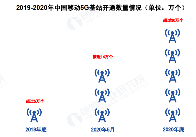 在2020年6月6日,工信部新聞宣傳中心舉行的“5G發(fā)牌一周年”線上峰會(huì)上,中國移動(dòng)表示目前已開通近14萬個(gè)5G基站,并將加快網(wǎng)絡(luò)建設(shè),確保年內(nèi)累計(jì)建成30萬個(gè)5G基站,實(shí)現(xiàn)在全國所有地級以上城市提供5G商用服務(wù),夯實(shí)經(jīng)濟(jì)社會(huì)數(shù)字化轉(zhuǎn)型的網(wǎng)絡(luò)基礎(chǔ)。