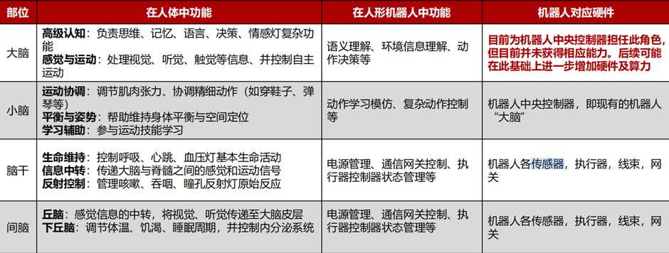 但對(duì)于高J認(rèn)知,信息處理能力尚未建立。展望未來(lái),機(jī)器人大小腦有望實(shí)現(xiàn)分離,大腦算力進(jìn)一步加強(qiáng),小腦專注運(yùn)動(dòng)控制。