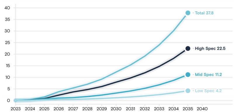 的總收入,到2050年可能產生約1萬億美元的總收入!边@一預測表明市場增長將出現(xiàn)急劇加速,特別是在2040年至2050年期間。