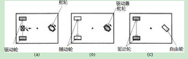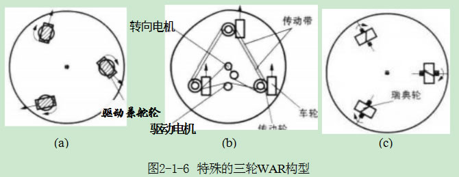 輪配置中也有一些很少見(jiàn)的配置方式,如圖2-1-6所示,圖2-1-6(a) 中 三 個(gè) 輪互成120°。車(chē)輪不僅可d立驅(qū)動(dòng)而且可以d立轉(zhuǎn)向;圖2-1-6(b) 三個(gè)車(chē)輪采用 同步驅(qū)動(dòng)系統(tǒng)控制,三個(gè)車(chē)輪同時(shí)用來(lái)驅(qū)動(dòng)與轉(zhuǎn)向,這種機(jī)器人一個(gè)突出的特點(diǎn)是機(jī)器人本體相對(duì)于地面的姿態(tài)保持不變;圖2-1-6(c) 互成120°布置的三個(gè)車(chē)輪采用瑞典輪,通過(guò)d立驅(qū)動(dòng)各輪可實(shí)現(xiàn)機(jī)器人全方位移動(dòng)。