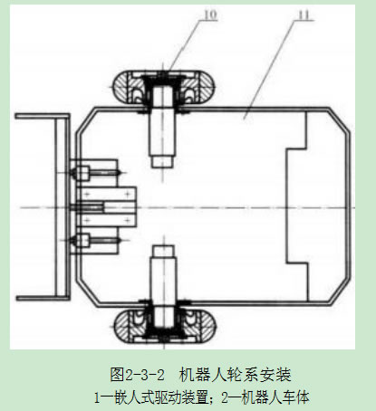 在該裝置中選用帶調(diào)速功能的直流電機作為動力,電機轉(zhuǎn)動時由電機軸直接 帶動,電機驅(qū)動法蘭盤與車輪緊固連接,繼而驅(qū)動車輪,實現(xiàn)直接驅(qū)動,車輪與電機 之間同步旋轉(zhuǎn),無任何變速環(huán)節(jié)和嚙合環(huán)節(jié),避免了累計回轉(zhuǎn)誤差和可能的打滑。 機器人車體上安裝左右兩個驅(qū)動裝置,通過對電機轉(zhuǎn)速的調(diào)節(jié)來控制車輪轉(zhuǎn)速和 回轉(zhuǎn)方向的變化,使機器人實現(xiàn)雙輪差動運動,走直線、圓弧甚至更復(fù)雜的運動。 橡膠車輪與電機安裝套間采用一對推力球軸承作為回轉(zhuǎn)副,軸承與電機安裝套。 外圈與橡膠車輪均為緊配合,兩軸承間以止推環(huán)和擋圈保持間距,軸承與電機安裝 套間通過軸承止推法蘭盤和電機安裝套的凸臺限位,保證整體機構(gòu)的穩(wěn)定和配合的緊密。整套裝置中,電機安裝套、電機驅(qū)動法蘭盤、軸承止推法蘭盤以及相應(yīng)連 接件推力球軸承、止推環(huán)、擋圈全部嵌入橡膠車輪中,配合緊密,同時起到車輪軸的 作用. 由于該結(jié)構(gòu)短而粗,所以剛度強度相當(dāng)大,能夠承受很強的沖擊。并且選用 的驅(qū)動電機嵌入電機安裝套,機器人對抗時車輪承受的沖擊由與車輪緊密配合的 電機安裝套等部件直接承受,避免了電機直接承受沖擊,起到緩沖作用。以上共同 構(gòu)成雙重嵌入式結(jié)構(gòu),結(jié)構(gòu)精簡、體積小,穩(wěn)定性高和緊密度高。嵌入式直接驅(qū)動 裝置如圖2-3-1所示,機器人輪系安裝如圖2-3-2所示。