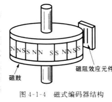 磁式編碼器是通過在強磁性材料表面上等 間隔的磁化刻度標尺,標尺旁邊相對放置磁阻 效應元件或霍爾元件,即能檢測磁通的變化,如 圖4-1-4所示,兩個磁傳感器的距離恰好是磁化 標尺間隔的1/4. 因此可以根據(jù)輸出信號的相位 關系檢測旋轉(zhuǎn)方向。與光學編碼器相比,磁式編 碼器的刻度間隔大,但它具有耐油污、抗沖擊等 特點。