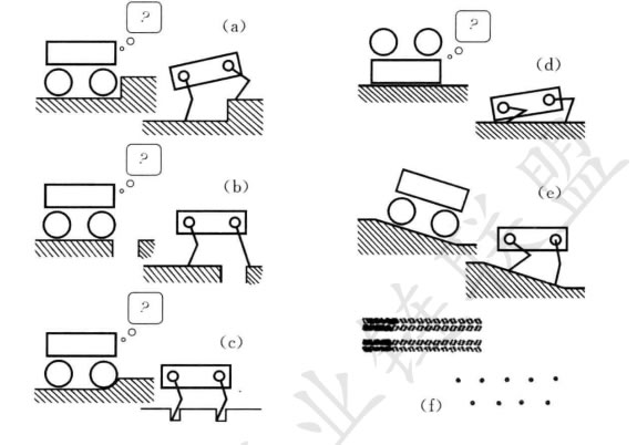 腿式運(yùn)動(dòng)以一系列機(jī)器人和地面之間的點(diǎn)接觸為特征。其主要優(yōu)點(diǎn)包括在粗糙地形上(圖2.5)的自適應(yīng)性和機(jī)動(dòng)性。因?yàn)橹恍枰唤M點(diǎn)接觸,所以只要機(jī)器人能夠 保持適當(dāng)?shù)牡孛嬲麧嵍,這些點(diǎn)之間的地面質(zhì)量是無關(guān)緊要的。另外,只要行走機(jī)器 人的步距大于洞穴的寬度,它就能跨越洞穴或者裂口。腿式運(yùn)動(dòng)的Z后一個(gè)優(yōu)點(diǎn)是, 能用高度的技巧來操縱環(huán)境中的物體。舉一個(gè)精彩的昆蟲例子,即甲殼蟲,它用靈巧 的前肢在運(yùn)動(dòng)的同時(shí)能夠滾動(dòng)一個(gè)球。