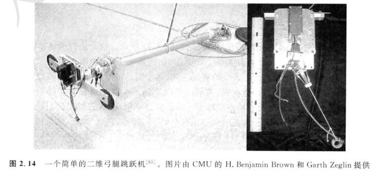 圖2.14表示的是Z近研制開發(fā)的更高效能的結(jié)構(gòu)[83,它利用了設(shè)計良好的機械 動力學(xué)83。它不用外裝的液壓泵供給能量,而是設(shè)計了弓腿跳躍機,當(dāng)它著地時,利 用一根有效的弓形彈簧腿來獲得機器人的動能。這個彈簧返回了幾乎85%的能量, 這就意味著每次只需要添加所需能量的15%即可穩(wěn)定跳躍。這個機器人用支架沿軸 受到約束,用裝在機器人上的一組電池,已經(jīng)展示能連續(xù)跳躍20 min 。和 Raibert 跳 躍機一樣,弓腿跳躍機通過在髖關(guān)節(jié)改變相對于身體的腿角來控制速度。