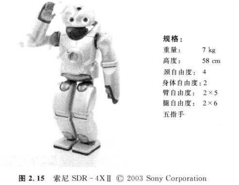 索尼夢想機器人,即SDR-4X Ⅱ模型,如圖2.15所示。這個流行的模型是1997 年開始的研究結(jié)果,它以運動表演和交際娛樂(如跳舞和唱歌)為基本目的。這個具 有38個自由度的機器人,為了聲音的精細定向、基于圖像的人員識別、單板微型立體 景深圖的重構(gòu)以及有限的語音識別,裝有7個麥克風。給定了流媒體和娛樂運動的 目標,索尼公司花費了巨大的精力設計了運動的原型應用系統(tǒng),它能使他們的工程師 以簡捷的方式編排舞蹈。要注意的是,SDR-4XI 比較小,站立58cm, 重量僅6.5kg。