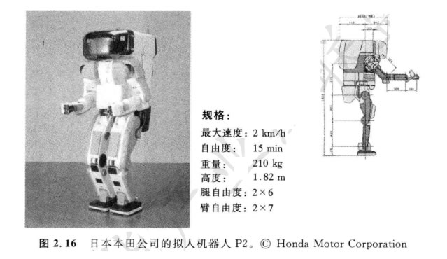 本田公司的擬人機器人項目有著值得注意的發(fā)展經(jīng)歷。但是此外,它還抓住了 激勵的非常重要的工程挑戰(zhàn)。圖2.16展示了模型 P2, 它是Z新模型 Asimo (在發(fā)明 移動性中有超前步伐)Z直接的先驅(qū)。注意,Z新的本田 Asimo 模型仍然比 SDR- 4X I大得多,高120 cm, 重52 kg 。這可在保持不危險尺寸和姿勢的同時,能在有樓 梯和臺階的人類環(huán)境中具有實用的機動性。也許這是展示仿生的雙腳上下樓梯的第 一個機器人。這些本田擬人系列的機器人不是專門為娛樂目的而設計,而是作為整 個社會的人類幫手而設計。例如,本田公司把Asimo 的高度當作機器人能對人類環(huán) 境進行管理操作(如控制燈開關)的Z小高度。