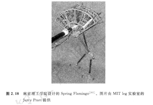 雙腳機器人只能在某些限制內(nèi)靜態(tài)地穩(wěn)定。因此,像P2 和WABIAN-2R 這樣的 機器人即使站著不動,通常也需要連續(xù)地進行伺服平衡校正。而且,各條腿都需要有足 夠的容量以支撐機器人全部重量。在四腿機器人情況下,平衡問題隨各條腿上的負荷 需求而變得容易解決。雙腿機器人的 一個 出色設計是麻省理工學院設計的Spring Fla- mingo (圖2. 18)。這個機器人與腿激勵器相連,插入了彈簧,實現(xiàn)更有彈性的步態(tài)。通過與限制膝蓋關節(jié)角度的“膝蓋骨”相結(jié)合,F(xiàn)lamingo 實現(xiàn)了驚人的仿生運動。