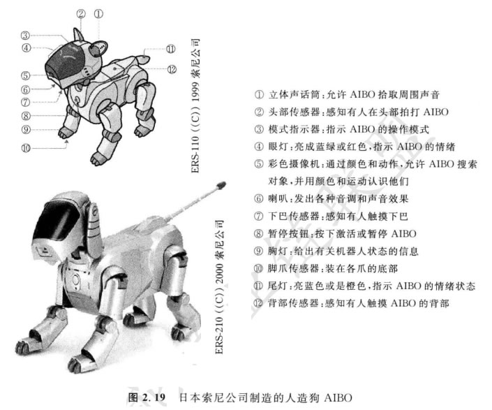 盡管四腿站立不動是無源穩(wěn)定的,但要行走仍具有挑戰(zhàn)性。因?yàn)樵诓叫衅陂g,為 了保持穩(wěn)定,機(jī)器人的重心需要主動地偏移。Z近,索尼投資數(shù)百萬美元開發(fā)一個叫作AIBO的四腿機(jī)器人(圖2.19)。為了制作這個機(jī)器人,索尼開發(fā)了近實(shí)時的新的 機(jī)器人操作系統(tǒng)和新的嚙合伺服電機(jī)。它具有足夠大的力矩以支持機(jī)器人,還是可 后向驅(qū)動的以保證安全。除了開發(fā)專用的電機(jī)和軟件之外,索尼公司還插入了一個 彩色視覺系統(tǒng),使AIBO 能夠追逐一個色彩鮮艷的球。在需要再充電之前,機(jī)器人至 多能工作一個小時。該機(jī)器人初期銷量曾經(jīng)很旺,D一年就賣了60000多臺?墒, 這臺機(jī)器狗所用的電機(jī)的數(shù)量和技術(shù)投資,使得它的售價高達(dá)約1500美元。