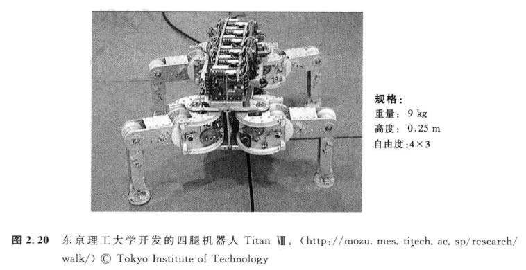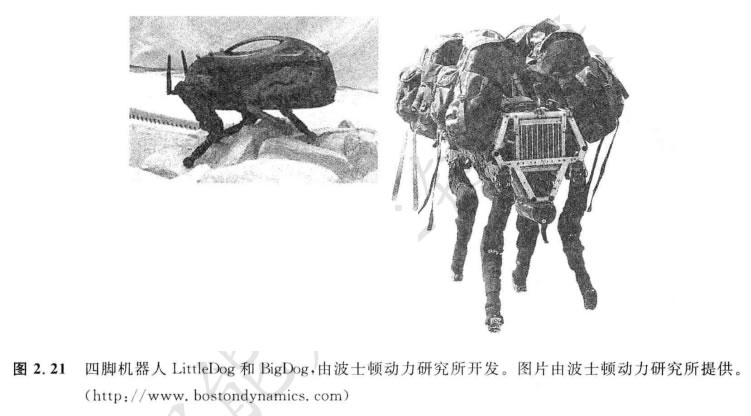 BigDog 和LittleDog(圖2.21)是四腳機(jī)器人的Z新例子,它們是受美國國防先 進(jìn)研究項目局(DARPA) 委托,由波士頓動力研究所開發(fā)的機(jī)器人。BigDog是一個 粗糙地形的機(jī)器人,能夠走、跑、爬,并運(yùn)載重負(fù)荷。它由一個發(fā)動機(jī)和驅(qū)動液壓激勵系統(tǒng)提供動力。它的腿像動物一樣與適從元件相連,吸收振動,并在二步之間循環(huán)能 量。該項目的目的,是使機(jī)器人能夠去人和動物能夠去的任何地方。這個項目由 DARPA 的戰(zhàn)術(shù)技術(shù)辦公室資助。相反,LittleDog是一個小尺寸的機(jī)器人,它是為研究學(xué)習(xí)運(yùn)動而設(shè)計的。它的每條腿具有大的運(yùn)動范圍,并由3個電機(jī)供能量。所以, 這個機(jī)器人在爬行和動態(tài)運(yùn)動步態(tài)方面,具有足夠強(qiáng)的功能。