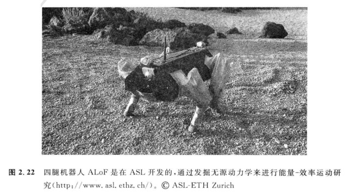 另一個四腿機(jī)器人的例子是ALoF, 該機(jī)器人是在ASL(蘇黎世瑞士聯(lián)邦理工大學(xué))開 發(fā)的(圖2.22)。它被當(dāng)作一個平臺,研究能量-效率運(yùn)動。這是通過發(fā)掘無源動力學(xué)來進(jìn) 行的,其方法如同2.2.2節(jié)所闡述的一樣,它在雙腳機(jī)器人中被證明是有效的。