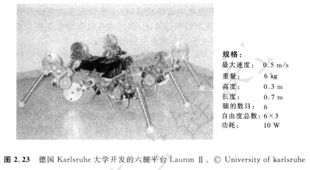 由于行走期間的靜態(tài)穩(wěn)定性,六腿結(jié)構(gòu)在移動機器人學中已經(jīng)很流行(圖2.23 和圖1.3),因而降低了控制的復(fù)雜性。在大多數(shù)情況下,各條腿有3個自由度,包括