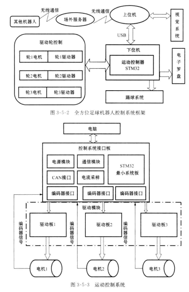 運(yùn)動(dòng)控制系統(tǒng)由通信模塊、電源模塊、控制模塊和電機(jī)驅(qū)動(dòng)模塊組成。一塊主 控制板(STM32) 控制3塊驅(qū)動(dòng)電路,分別驅(qū)動(dòng)3個(gè)全方位輪,實(shí)現(xiàn)3軸聯(lián)動(dòng)。當(dāng)機(jī)器人工作時(shí),通信模塊負(fù)責(zé)從PC 機(jī)接收指令數(shù)據(jù),包括3個(gè)輪子的速度和是否踢 球判斷以及踢球力度?刂颇K將3個(gè)輪子的速度發(fā)送到運(yùn)動(dòng)控制模塊,并產(chǎn)生 一個(gè)踢球信號(hào)控制氣動(dòng)踢球系統(tǒng)產(chǎn)生踢球動(dòng)作。運(yùn)動(dòng)控制模塊則控制著3個(gè)輪子 的速度,并且將通過(guò)閉環(huán)采集到的電機(jī)碼盤(pán)信息獲得的3個(gè)輪子的速度反饋回PC 機(jī),供機(jī)器人上層策略算法使用。其結(jié)構(gòu)圖如圖3-5-3。通信模塊和運(yùn)動(dòng)控制模塊的CPU采用的是 STM32F103CB。