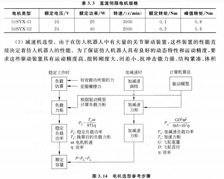 電機是將電能轉(zhuǎn)化為機械能的部件,由此發(fā)生的力經(jīng)過以減速器為核心的動力傳遞 系統(tǒng)到達負載端。在此過程中, 一部分力克服摩擦,以熱能的形式耗散出去,因此傳動效 率無法達到100%。在實際設計中,應該將上述路線的順序倒過來,即以負載的大小和摩 擦系數(shù)及運動效率去推算電機的容量。施加于電機的負載大致可以劃分成三種基本類 型:有效力、無效力、慣性力。智能交互機器人的驅(qū)動器大致有直流電機、步進電機、舵機。如 圖3.14所示為電機選擇的方法和步驟。從圖中可知,決定電機容量時,涉及負載估算、 驅(qū)動對象運動規(guī)律確定、傳動系統(tǒng)轉(zhuǎn)動慣量折算等內(nèi)容[96]。