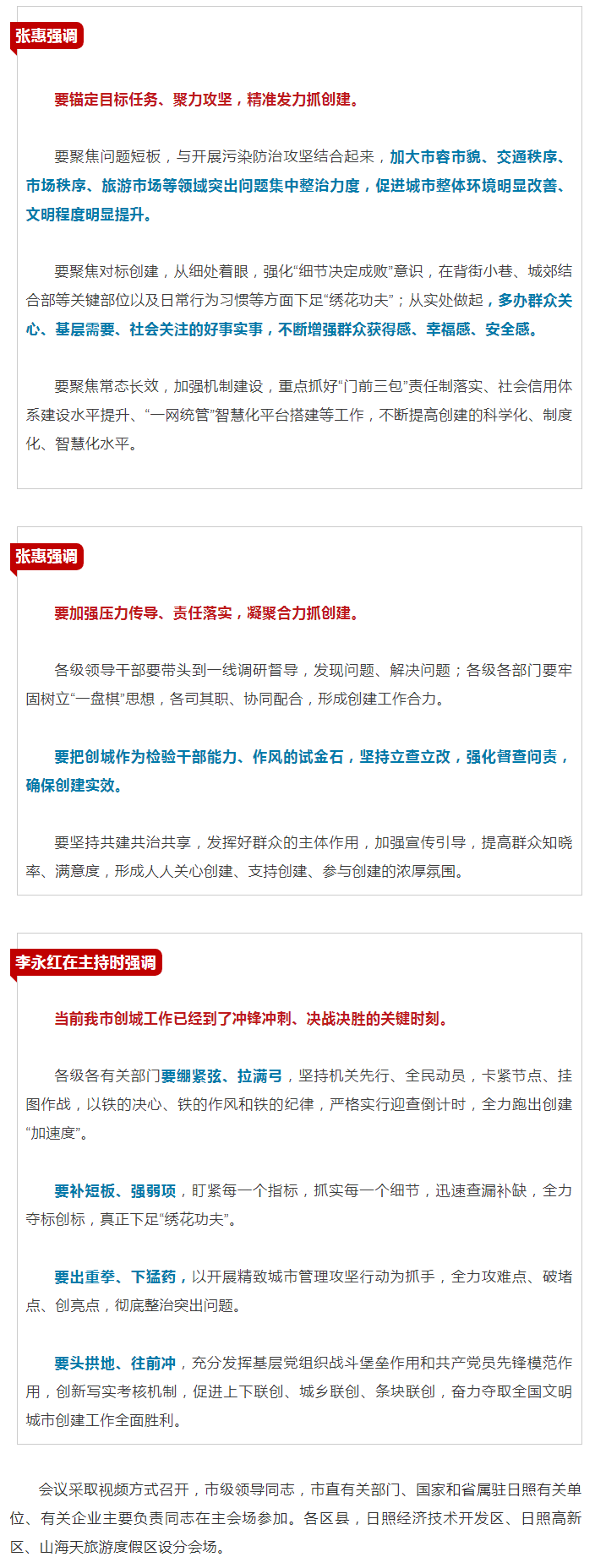 市委書記張惠講話,市委副書記、市長李永紅主持,市政協(xié)主席王斌,市人大常委會主任G杰,市委副書記李在武出席,市委常委、統(tǒng)戰(zhàn)部長楊留星通報創(chuàng)城模擬測評情況。東港區(qū)、嵐山區(qū)、日照經(jīng)濟技術開發(fā)區(qū)、日照G新區(qū)、山海天旅游度假區(qū)、市城市管理局、市市場監(jiān)管局、市公安局交警支隊負責同志作表態(tài)發(fā)言。