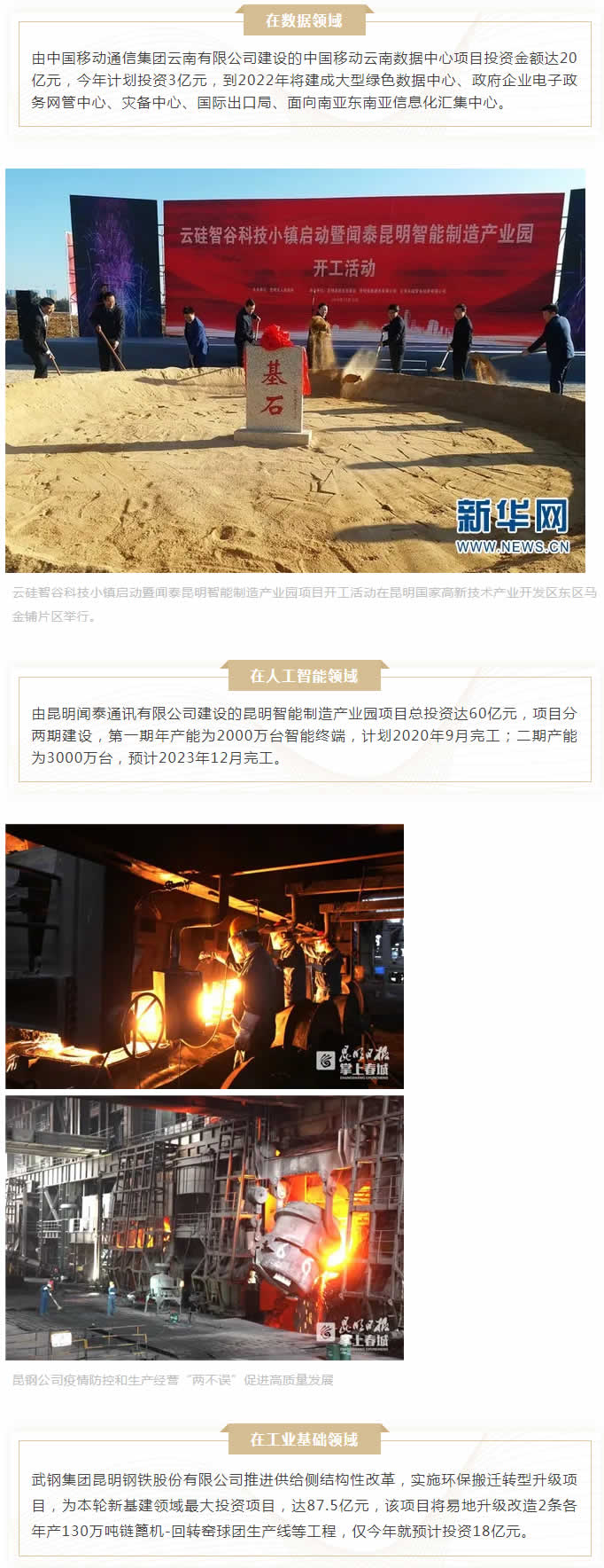 《通知》明確了今年年度投資計劃,即昆明市2020年新型基礎(chǔ)設(shè)施建設(shè)投資項目62個,總投資1953.45億元,2020年計劃投資302.26億元,其中,續(xù)建項目30個,總投資1002.43億元,2020年計劃投資204.01億元;新開工項目32個,總投資951.02億元,2020年計劃投資98.25億元。