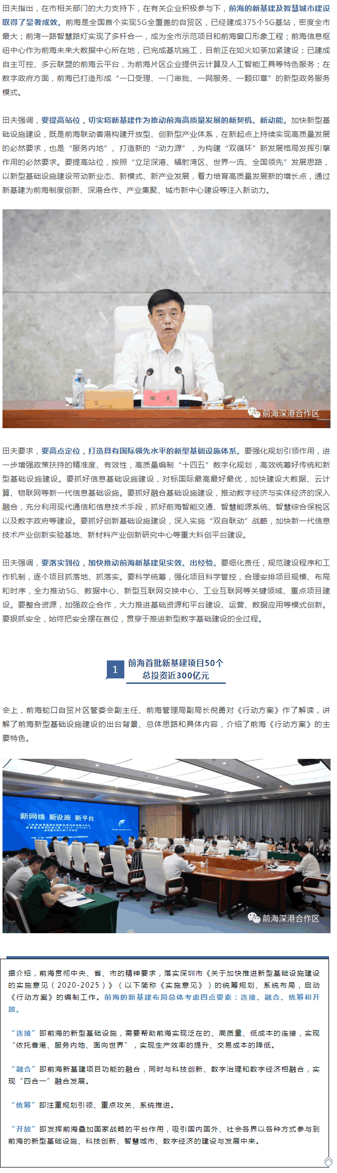 市委常委、前海合作區(qū)黨工委書記、前海蛇口自貿(mào)片區(qū)管委會(huì)主任田夫出席會(huì)議,宣布《行動(dòng)方案》正式發(fā)布,并就前海“新基建”作動(dòng)員部署。市通信管理局局長何承健、市發(fā)展和改革委員會(huì)副主任曾堅(jiān)朋、市工業(yè)和信息化局副局長何志梅、市政務(wù)服務(wù)數(shù)據(jù)管理局副巡視員陳朝祥,前海蛇口自貿(mào)片區(qū)管委會(huì)副主任、前海管理局副局長謝暉暉、倪勇出席會(huì)議。前海蛇口自貿(mào)片區(qū)管委會(huì)副主任、前海管理局副局長劉昌松主持會(huì)議。