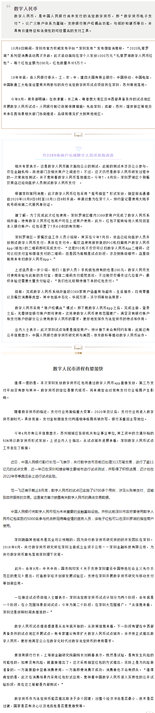 方案要求在中國(guó)人民銀行數(shù)字貨幣研究所深圳下屬機(jī)構(gòu)的基礎(chǔ)上成立金融科技創(chuàng)新平臺(tái)。支持開展數(shù)字人民幣內(nèi)部封閉試點(diǎn)測(cè)試,推動(dòng)數(shù)字人民幣的研發(fā)應(yīng)用和國(guó)際合作