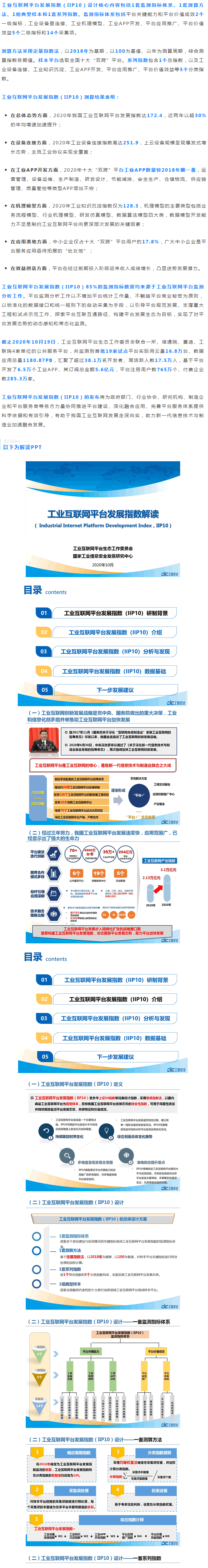 在2020年10月21日的兩化融合暨工業(yè)互聯(lián)網(wǎng)平臺(tái)大會(huì)的開幕式上,工業(yè)互聯(lián)網(wǎng)平臺(tái)發(fā)展指數(shù)(IIP10)正式發(fā)布。該指數(shù)是受工業(yè)和信息化部信息技術(shù)發(fā)展司委托研究,由工業(yè)互聯(lián)網(wǎng)平臺(tái)生態(tài)工作委員會(huì)和國家工業(yè)信息安全發(fā)展研究中心聯(lián)合研制。
