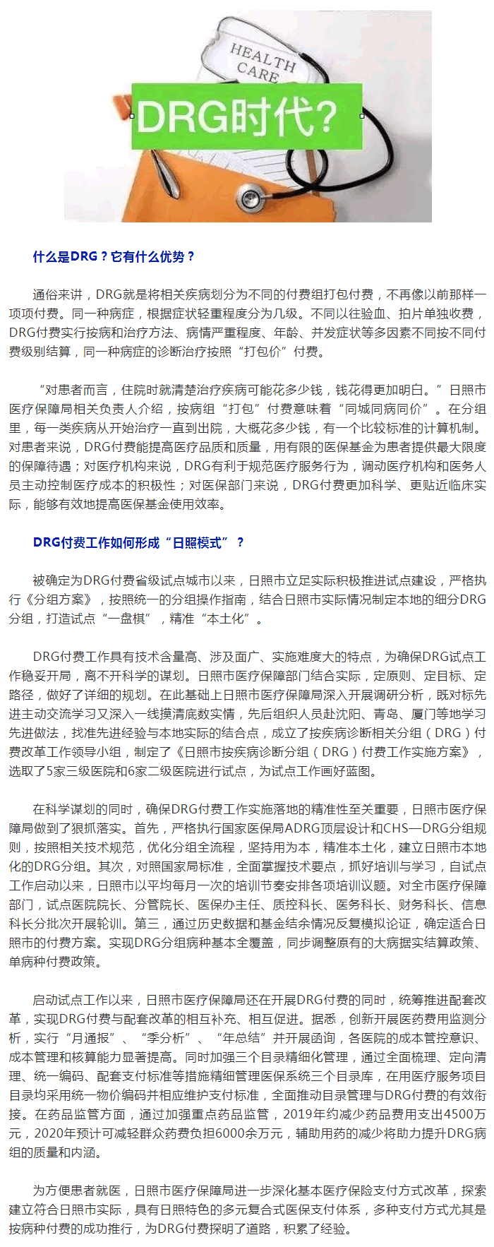 一直以來,傳統(tǒng)的“按項(xiàng)目付費(fèi)”方式被認(rèn)為是導(dǎo)致過度醫(yī)療、大處方的重要原因之一,在浪費(fèi)醫(yī)療資源的同時(shí)也加重了老百姓就醫(yī)負(fù)擔(dān),呼吁改革的聲音不斷。為健全醫(yī)保支付機(jī)制,激發(fā)醫(yī)療機(jī)構(gòu)規(guī)范行為、控制成本的內(nèi)生動(dòng)力,去年5月,國家醫(yī)保局啟動(dòng)按疾病診斷相關(guān)分組(DRG)付費(fèi)試點(diǎn),山東省在組織青島市參加國家試點(diǎn)的同時(shí),首批選取10個(gè)市開展DRG付費(fèi)省級試點(diǎn),日照市位列其中。