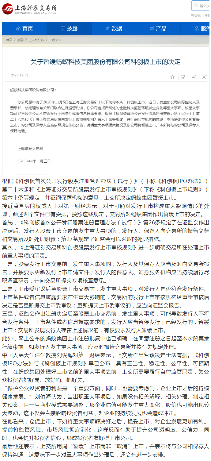 11月3日,上海證券交易所(下稱“上交所”)發(fā)布了《關(guān)于暫緩螞蟻科技集團股份有限公司科創(chuàng)板上市的決定》。