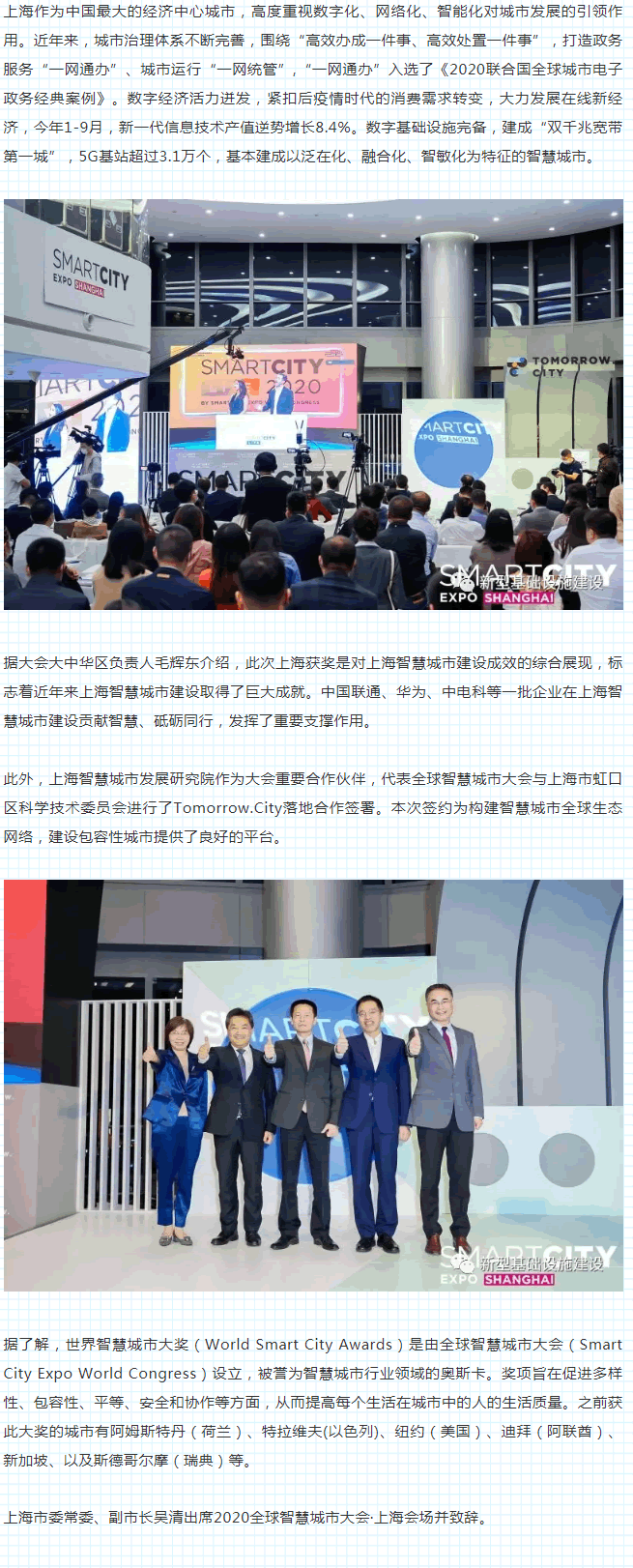 11月18日晚,2020智慧城市大會(huì)(Smart City Expo World Congress,簡稱SCEWC)正式發(fā)布世界智慧城市大獎(jiǎng)獲獎(jiǎng)名單。在350個(gè)城市中,上海脫穎而出,獲得G殊榮——世界智慧城市大獎(jiǎng)。這是中國城市首次獲得該獎(jiǎng)項(xiàng),代表上海的智慧城市建設(shè)成效卓著,得到來自的廣泛關(guān)注和G度認(rèn)可。