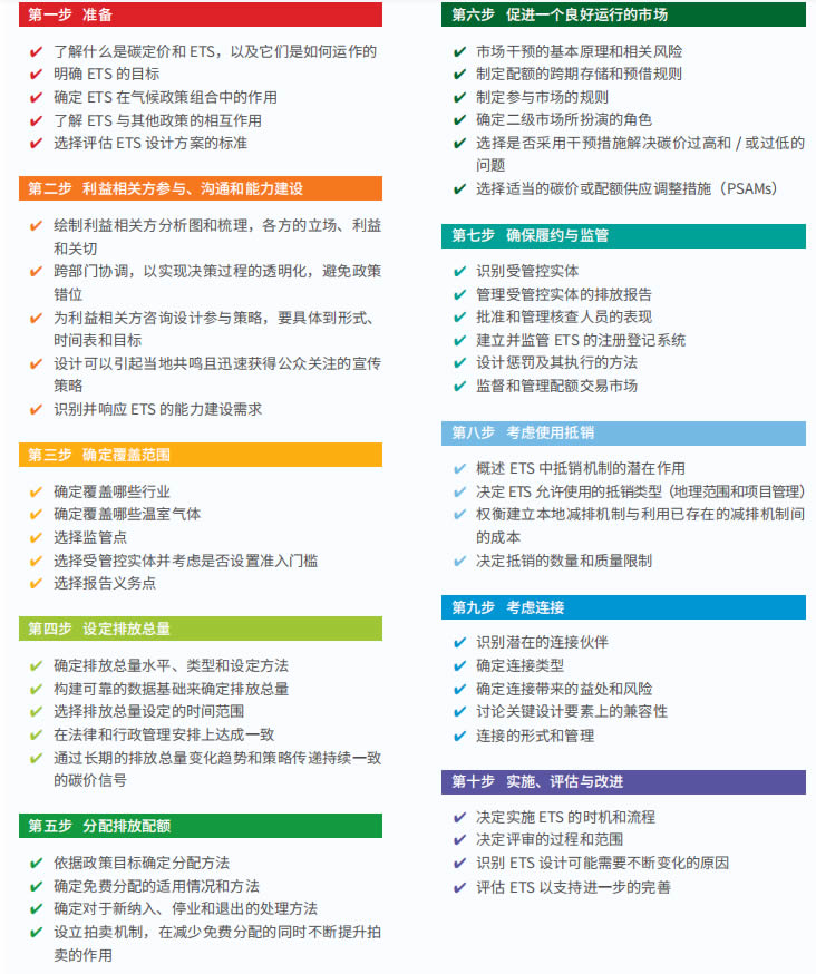 這些步驟之間相互依存,每一步所作的選擇都將對(duì)其他步驟的決策產(chǎn)生重要影響。在實(shí)踐中,ETS 的設(shè)計(jì)過程是“迭代”而 非“線性”的。2016 年初版手冊(cè)發(fā)布之后,隨著 ETS 在各個(gè) 國家和地區(qū)的發(fā)展,很多新見解、新方法和新設(shè)計(jì)思路都影響著 ETS 的運(yùn)行方式,也進(jìn)一步加深了我們對(duì)于 ETS 的理解和認(rèn)識(shí)。所有這些新內(nèi)容我們都在本手冊(cè)的相關(guān)章節(jié)中予以更新。