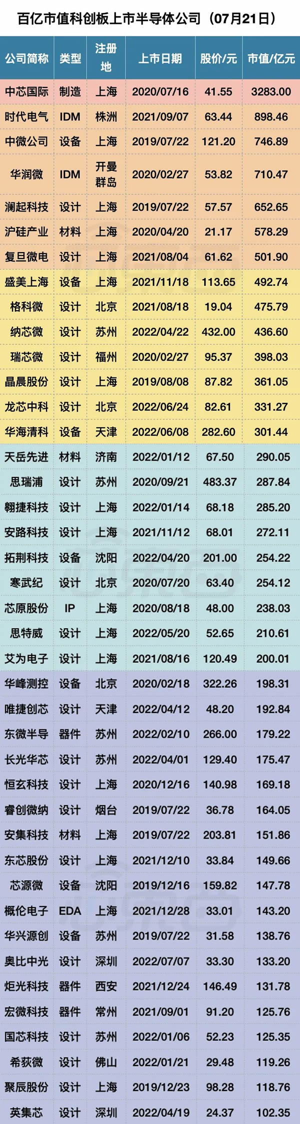 科創(chuàng)板已上市的半導(dǎo)體相關(guān)企業(yè)共70家,約占科創(chuàng)板上市公司數(shù)量的16.0%,總市值達(dá)1.70萬億元,約占科創(chuàng)板總市值的30.4%,39家科創(chuàng)板上市芯片設(shè)計企業(yè)