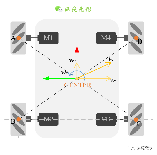 麥輪平臺是全向移動機(jī)器人的原因是其有三個自由度,意味著可以在平面內(nèi)做出任意方向平移同時自旋的動作,如圖 2.1所示,采用任意方向的線速度及角速度[vc w]T來描述CENTER的速度,而vc可沿著坐標(biāo)軸分解為兩個分速度,表示為[vcx vcy w]T。