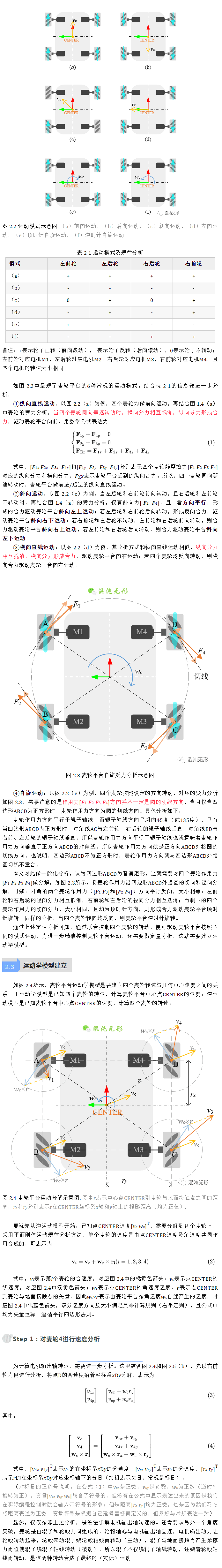 要滿足上述的分力能夠相互抵消的條件是麥輪(或電機(jī))轉(zhuǎn)速大小相同,因為每個麥輪受到的地面支持力相同(基于假設(shè)①②),4個電機(jī)又勻速等速轉(zhuǎn)動,意味著電機(jī)輸出扭矩與地面作用于麥輪的摩擦力是平衡的,4個麥輪摩擦力在輪轂軸向和徑向上分解的大小是相同的,而速度分解與力分解類似,所以4個麥輪沿輪轂軸向和徑向的分速度大小是相同的。