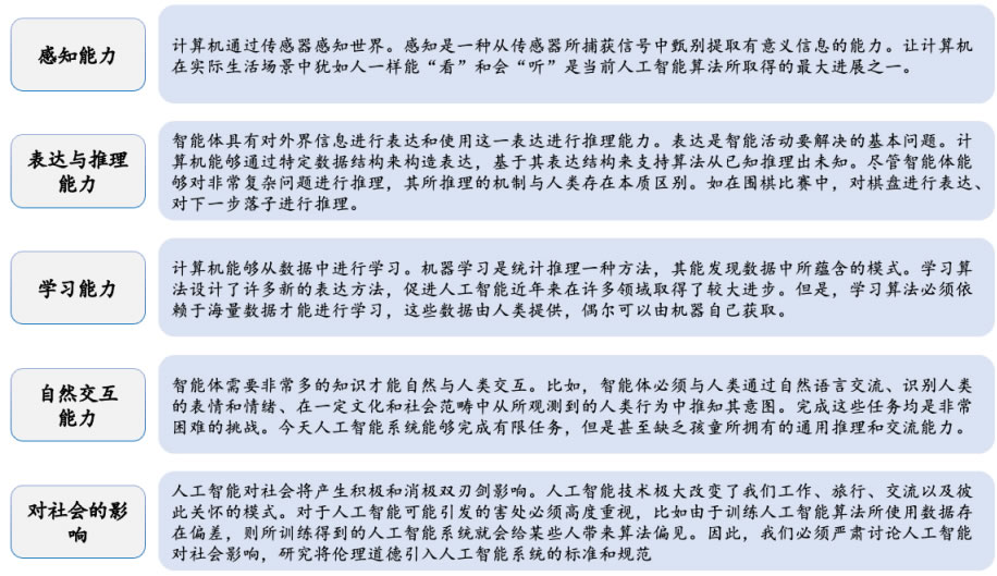 A14K12 將 K12 四個年齡層次學生需要掌握的知識點分為智能感知、表示和 推理、 機器學習、 自然交互和社會影響五個方面, 即教育學生了解計算機通過傳感器感知環(huán)境的能力、 計算機通過對環(huán)境建模和表示方法進行推理的能力、 計算 機從數(shù)據(jù)中進行學習的能力、 計算機與人類自身自然交互能力、智能算法對社會 發(fā)展正面和負面的影響等內(nèi)容。