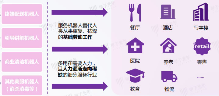 服務(wù)場(chǎng)景當(dāng)中,疫情下人與人的接觸成為服務(wù)場(chǎng)景的限制因素,催生了餐廳、酒店、醫(yī)院、寫(xiě)字樓等場(chǎng)所機(jī)器人“無(wú)接觸”配送的應(yīng)用需求;