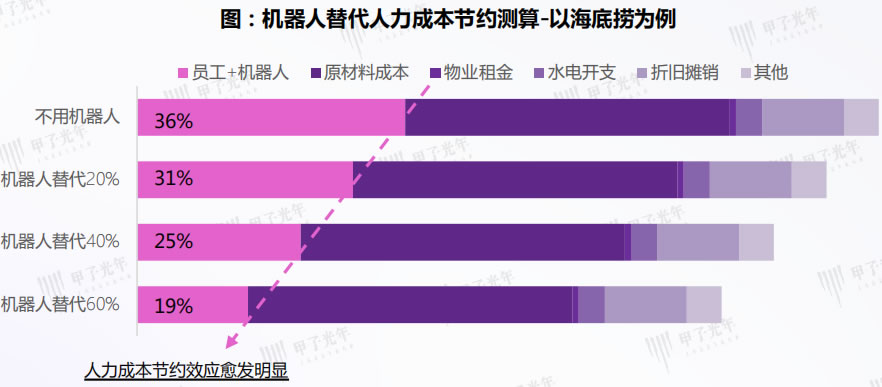 3 按每臺機器人替代2-3名傳菜員來看,餐飲機器人的應(yīng)用可將海底撈的員工成本占比由36%減低到31%